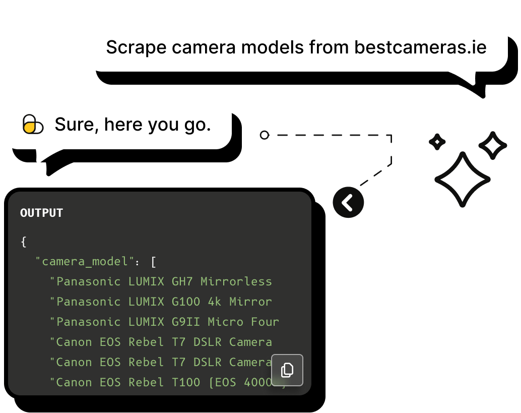 SeekWell ScrapingBee simplified our day-to-day marketing and engineering operations a lot. We no longer have to worry about managing our own fleet of headless browsers, and we no longer have to spend days sourcing the right proxy provider Code Response Input Parameters ai_query AI Query Describe in natural language the content you want to extract. ai_selector AI Selector Optionally provide a DOM entry as root element. ai_extract_rules AI Extract Rules JSON rules specifying what each scraped JSON object should be.AI Web Scraping API